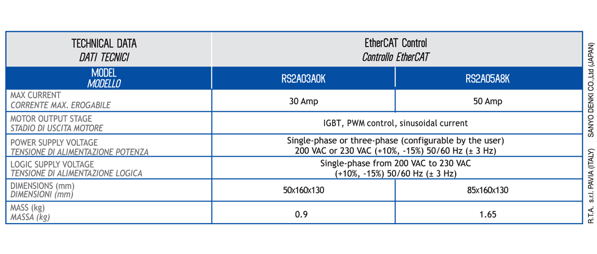 The wide range of RS2 series servoamplifiers with ETHERCAT interface produced by SANYO DENKI offers high quality and reliability, Safe Torque Off (STO) - SIL2, very compact size and high performance built-in functions, specially designed